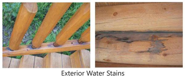 Exterior water stains typically occur around checks, fissures, and other openings that collect rain water. The water soaks into the wood and as it evaporates out of the wood, it brings along the colored extractives which can then become visible on the surface. In some cases, water-soluble tannins may react with minute particles of steel on the surface, forming dark iron tannate stains.