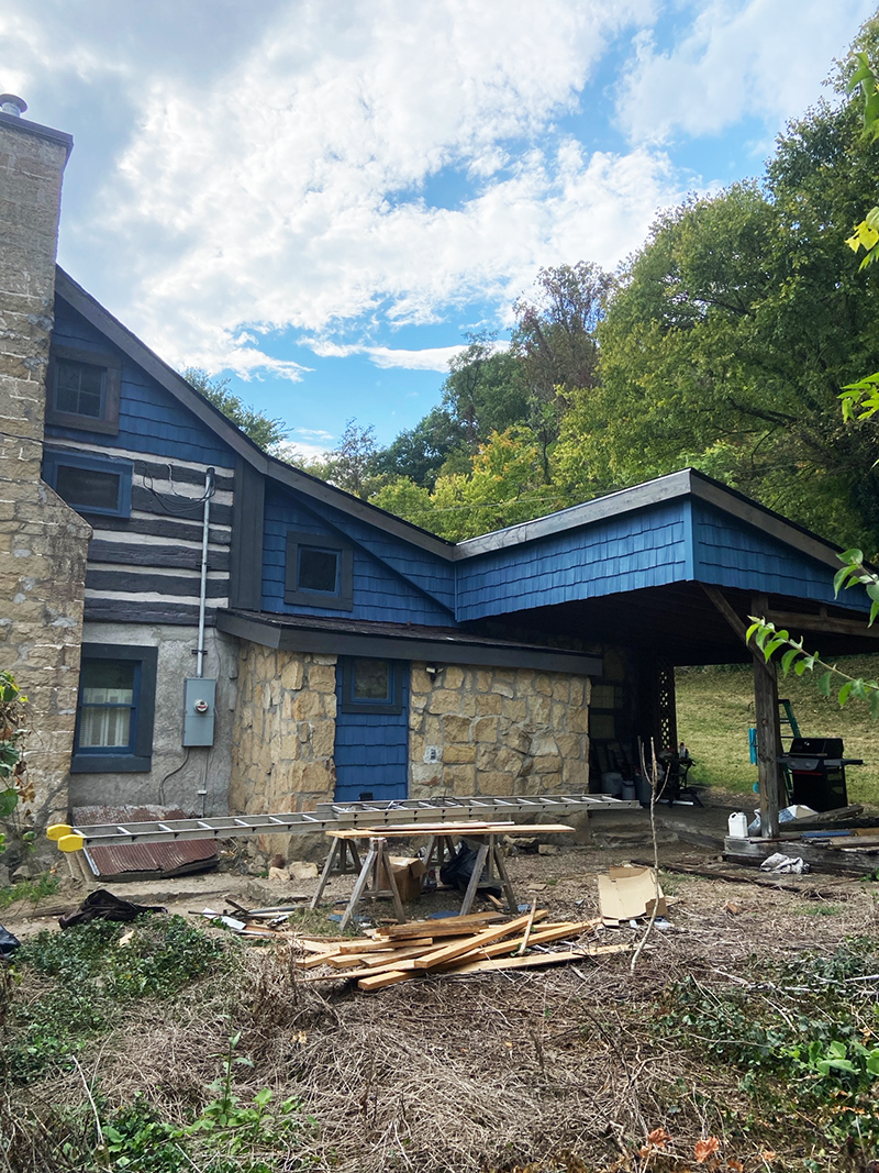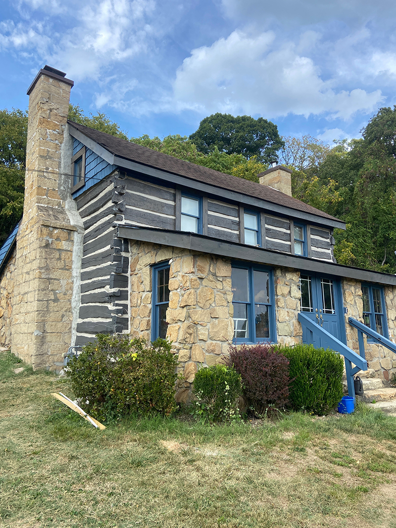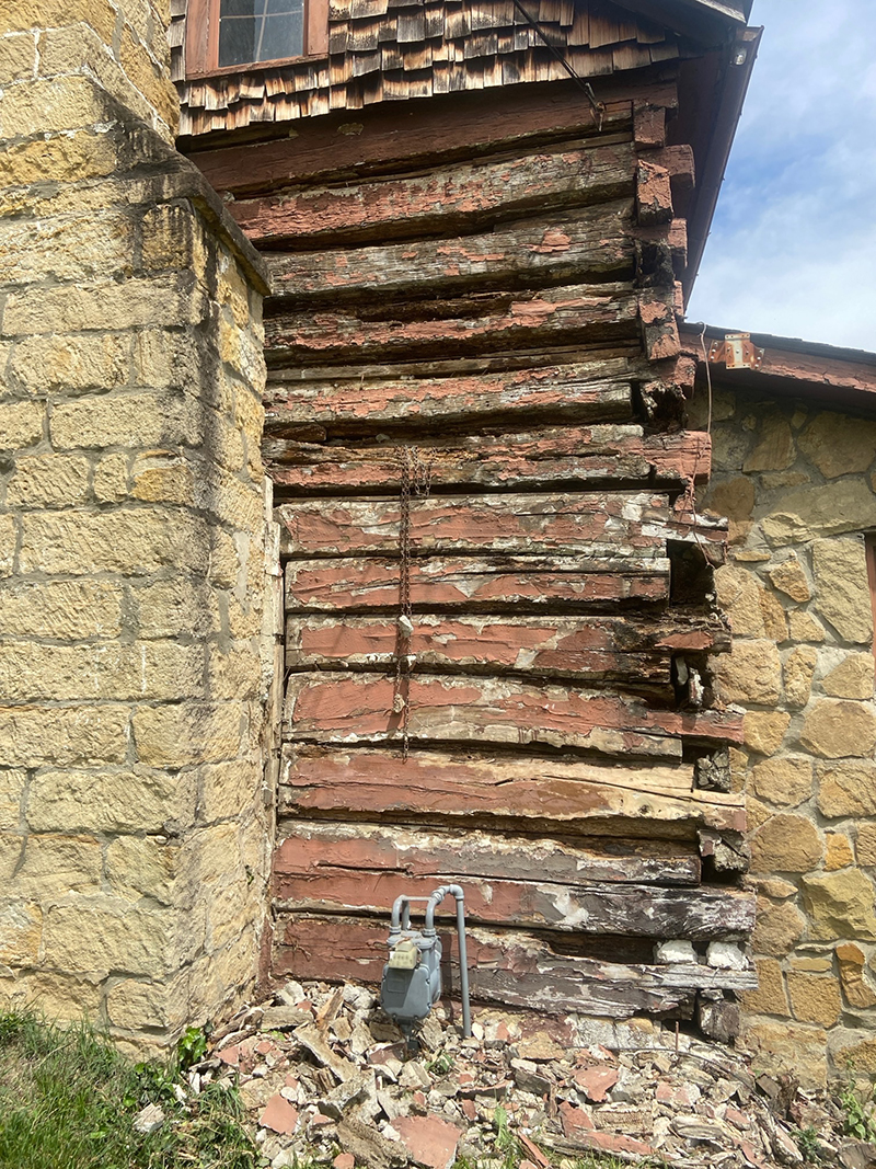 The main structure is a two-story, roughly 28' x 35', built over a 5-foot crawl space/cellar. It originally featured half-dovetail log corners (a hallmark of German-influenced craftsmanship) and horsehair chinking, which was later patched with cement. After 1925, a family room addition and enclosed front porch were added, using sandstone quarried right on the property. The original upper gables were covered in hand-split cedar shakes, which the client asked us to update with cedar shake-style vinyl siding for easier upkeep.