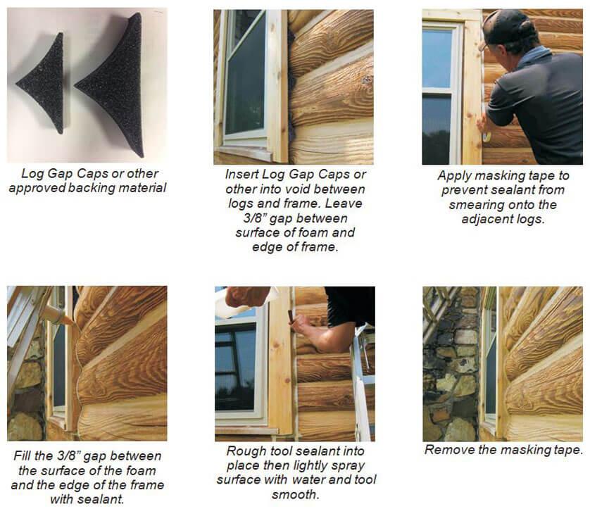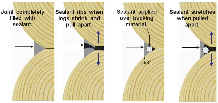 When deciding the width of a sealant joint between round logs a good guideline to follow is for the width of the sealant to be one-sixth the log diameter. For example, with six inch diameter logs 6” ÷ 6 = 1.0” wide sealant joint. The width of the backing material you require depends on the profile of your logs but you need to take into account that you will be applying a 3/8” thick layer of sealant over it and you’ll need at least ¼” top and bottom for adequate adhesion to the wood.
