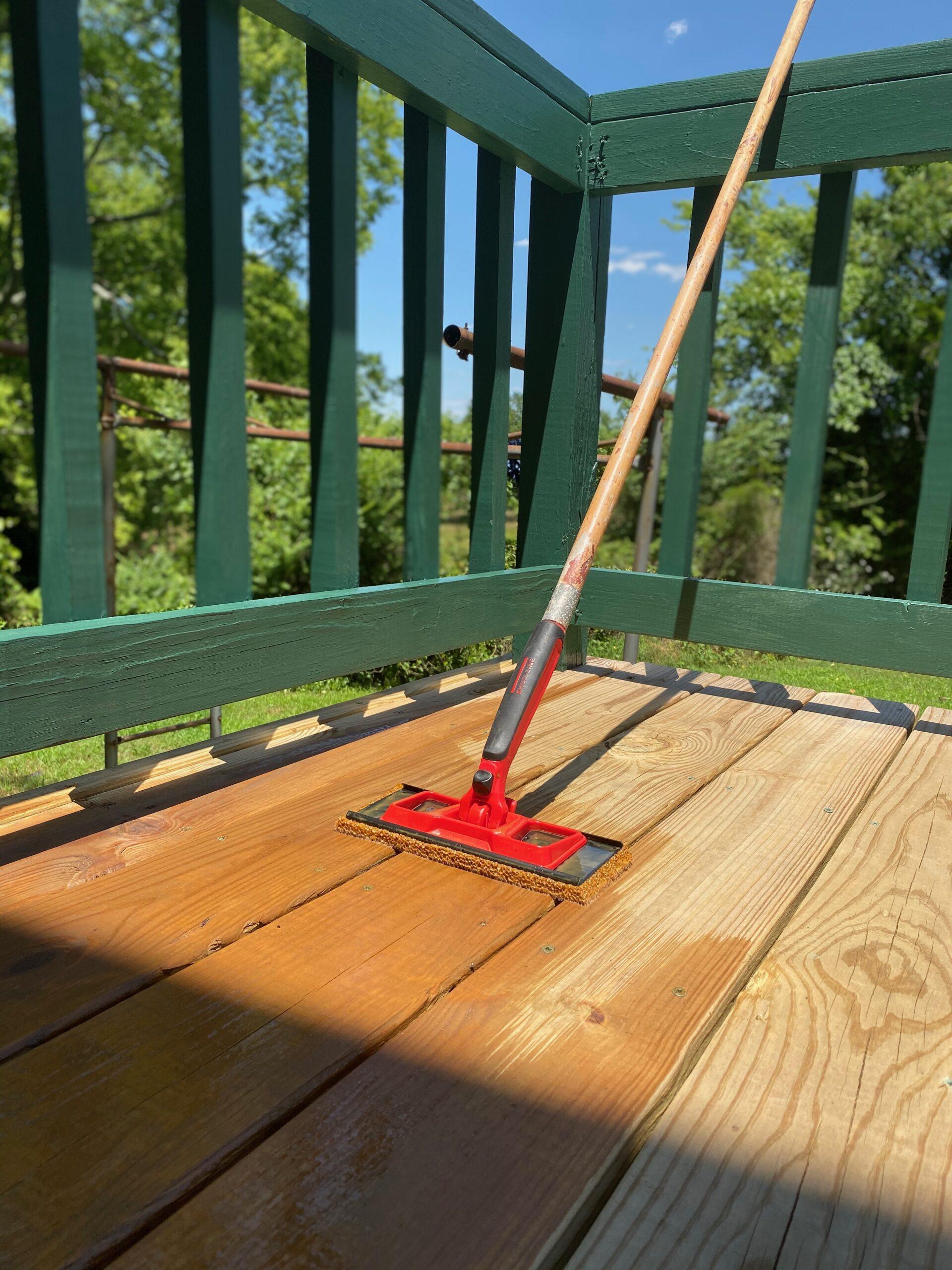 We used a pad specifically designed for this purpose, and it worked very well. The stain was beautiful as it contrasted and blended the beige vinyl siding on the house with the dark green paint we selected for the railing and bannister. The staining process was far easier than that of painting.
