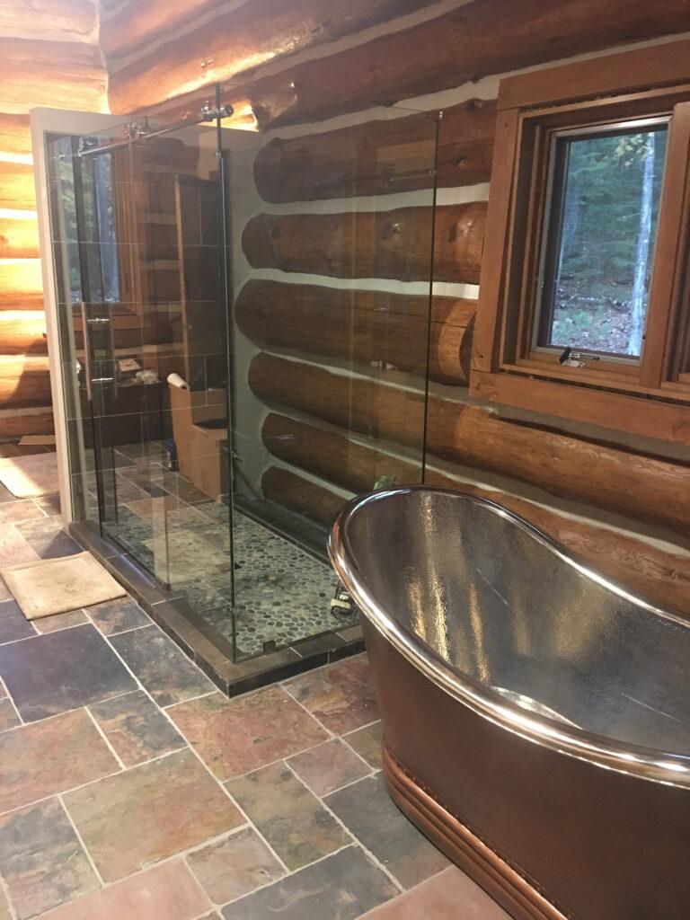 The exterior is finished with Lifeline Ultra-2 Sequoia with Advance Gloss, and log gaps sealed with Perma-Chink Stone. Interior logs and beams were finished with Lifeline Ultra-2 Dark Natural and Advance Gloss topcoat for the rest. Gaps were filled with Energy Seal – Dark Natural for interior, Dark Walnut for exterior gaps.