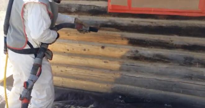 Round logs are a pain to sand with a flat belt. Getting to every corner and crevice takes hours, and the dust is not so great on our lungs in the meantime. Well, now you can file all those inconveniences under ancient memory. It might sound crazy at first, but the latest and greatest dry method around is blasting that aging, discolored finish off with new age glass media. Glass media is lighter than sand, so while it strikes your home with necessary force, it has less weight – this allows it to remove the stain without harming the wood. There is also no risk of blowing water into your house because the media is dry, and you can re-stain immediately.