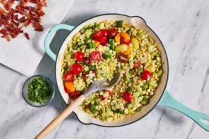 The list of ingredients for this Southern succotash recipe – including fresh corn, tomatoes, lima beans, and okra – are practically synonymous with summer (something we’re thankful for). And the combination of these five complementary flavors is only heightened with the additions of crumbled bacon and fresh basil.