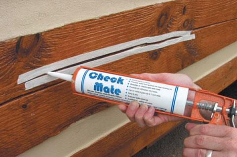 Remember to use a backer material to keep the sealant thickness between 1/4 and 3/8 inch along the check. Also, fill the check completely up and a little beyond the log surface to allow for some shrinkage for the sealant as it dries.