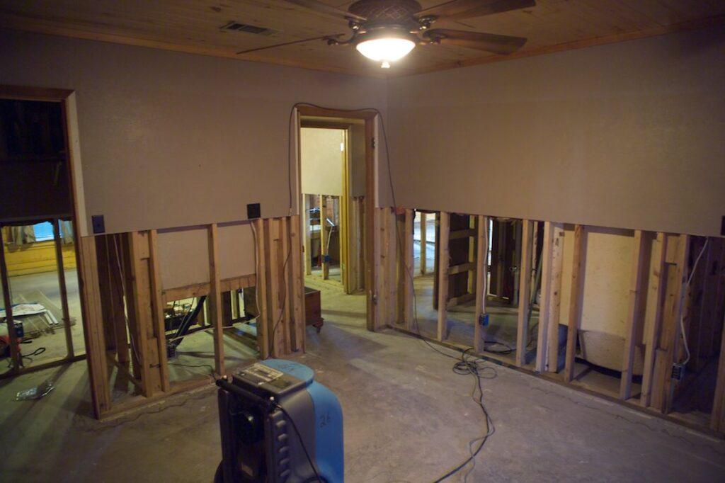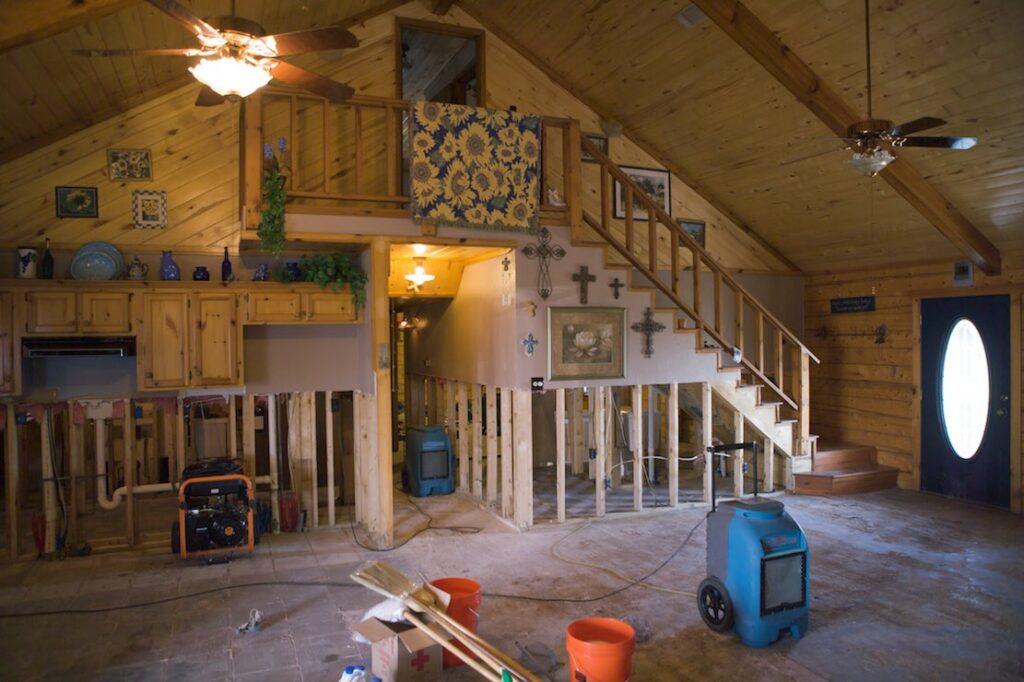 1) Tear out everything that is obviously ruined or that will interfere with drying out the log walls. All floor coverings (you will not be able to save any wooden floor – even if it looks good now, it will warp), trim, drywall, and insulation must go. You will probably have to replace all wet cabinetry and interior doors that were stained or contained any type of composite wood. Sometimes cabinets and doors can be saved if they were initially painted or if you choose to paint them now. Cut drywall and insulation about a foot above the high water mark. Sometimes tile floors can be saved, depending on the backer used under the tile.