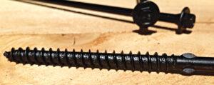 One of the most outstanding features of the fastener is the ‘wings’ above the threads. The goal was not to disturb the thread holding value but to drive the fasteners into timbers with less torque requirements. The wings act as a reamer, allowing the shank to rotate much easier with less friction in the log. Without wings, the wood fibers bind up on the shank, seizing it to the point it becomes almost impossible to complete the required depth. It also often results in fasteners breaking off just above the threads, which adds wasted time to the project.