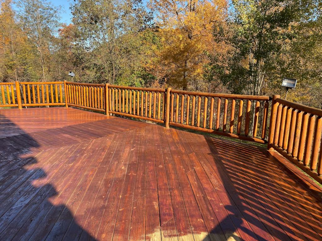 Deck handrails present a real challenge to film forming finishes, especially if they are new. Here’s why. Round log handrails are typically fabricated using green wood. Once in place and begin to dry, handrails shrink, crack, and develop fissures to relieve the stress due to shrinkage. There is no way to prevent this from occurring. If a finish is applied before these fissures open up, and once they do open, they provide a path for water to soak into the rail behind the finish. When the sun comes out and the rail heats up, the water turns into water vapor which may exert enough pressure to actually push the finish right off the wood. In winter months, the water in the wood will freeze and expand and that, too, can pop the finish off the surface.