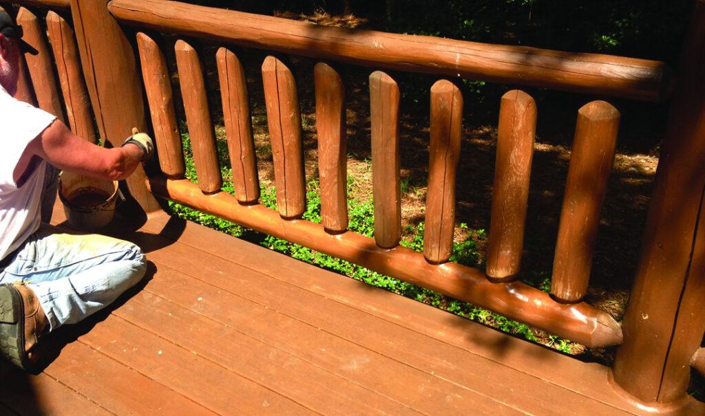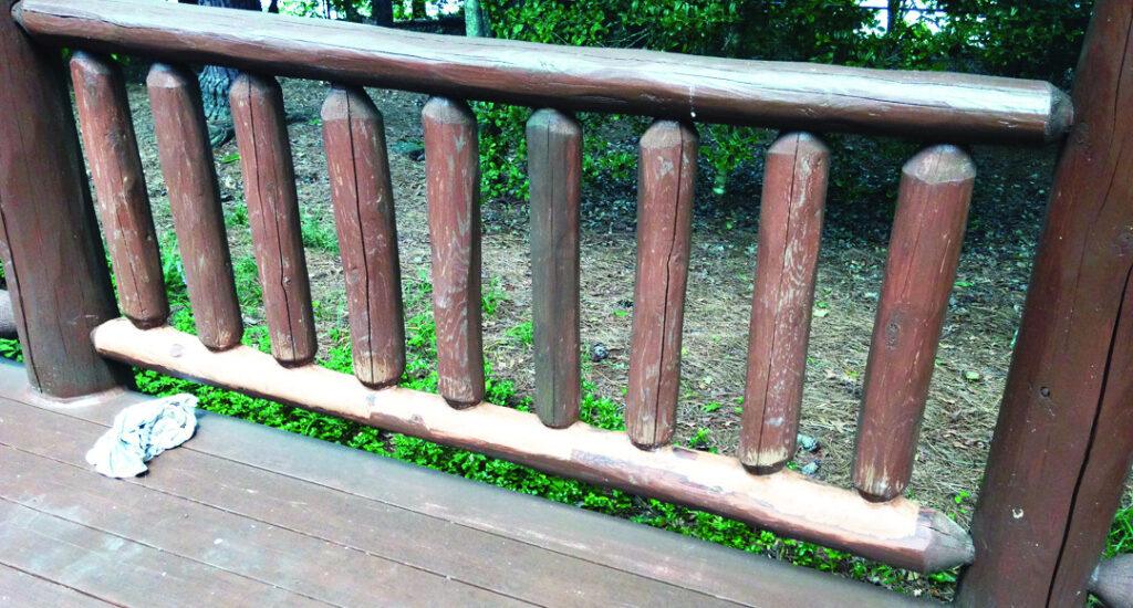 If you have elected to allow the handrails time to dry before staining, during the waiting period there’s a good chance that some surface graying will have occurred, so a light sanding with 60 to 80 grit sandpaper, nothing finer, as well as a wash-down with Log Wash is recommended before the application of one or two coats of Deck Defense. Be sure to get some stain into all cracks and fissures and again, no topcoat should ever be applied to horizontal handrails or over Deck Defense.