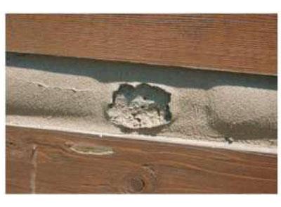 Another common cause of blisters is chinking over unsuitable backing materials. This includes blue board, pink board, and other colored EPS (expanded polystyrene) foam and bare wood. These materials out-gas and as they do, they can form blisters in the soft, uncured chinking.