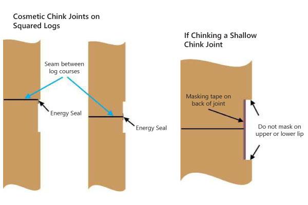 Whenever Chink Paint is used and a seam is present within the cosmetic joint, the seam may be first sealed with Energy Seal. Once the Energy Seal is dry, Chink Paint can be applied over it. Do not use masking tape under Chink Paint. It will prevent the Chink Paint from adhering to the wood and may eventually peel off.