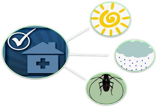 The second challenging variable for wood in a coastal environment is moisture. Coastal areas are notorious for their high relative humidity and pop-up thunderstorms. Keeping wood dry is the goal to protecting its long term integrity. If wood remains wet for long periods of time without drying out, conditions are favorable for the formation of wood decay fungi, the precursor to wood rot. Four conditions are necessary for the development of wood decay producing fungi. Eliminate any one of these and decay fungi cannot survive: oxygen, temperature (40° – 90°F), moisture content in excess of the fiber saturation point (> 25-30%), and a suitable source of energy and nutrients (that is, the wood).
