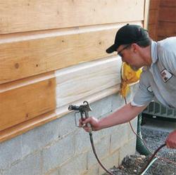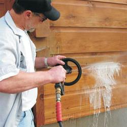 Although we rent and sell the Blaster Buddy™ and furnish crushed recycled glass blasting media, we usually advise do-it-yourself homeowners to use chemical finish removers along with pressure washing because the process can be easily accomplished by an average homeowner and it is less susceptible to surface damage, resulting in a more attractive finished surface. However, when performed by an experienced professional, media blasting can effectively and efficiently remove the most stubborn existing finish. We do recommend that you first inspect a home that has been media blasted before making your final decision about which method of finish removal you want to use.