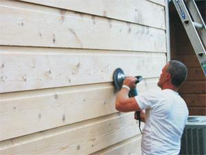Step 7. If pressure washing the wall has feathered the surface, you may wish to lightly sand it or use an Osborn™ Brush to remove the feathered wood fibers. Never use sandpaper or Osborn Brushes finer than 80 grit on exterior surfaces. Sanded or brushed surfaces MUST be washed with two (2) cups per gallon Log Wash solution and the surface allowed to dry before the first coat of finish is applied.