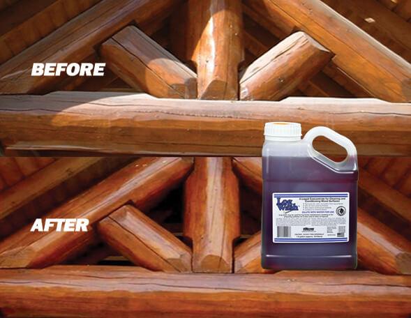 Repair of the aged, grayed wood surfaces was accomplished with Wood ReNew. Being on the water, the home’s exposure to the weather gave the logs varying degrees of aging. Wood ReNew brightened up the wood, bringing back a true wood color, and was now prepared for staining.